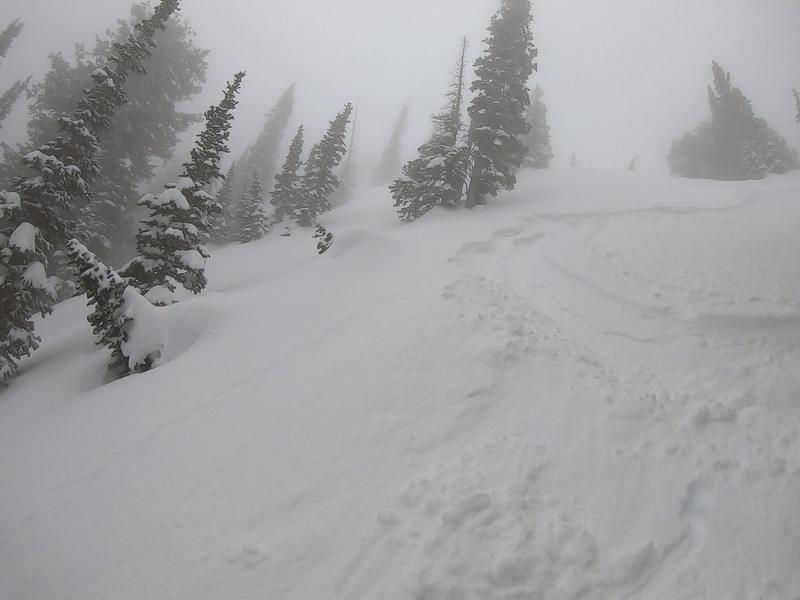 Snow/rain mix was present at the trailhead and continued until about 8000ft. Snow was enjoyable up at the higher elevations, but as I said earlier it very poorly bonded to old snow. As I got down below 9000ft on my descent snow became noticeably wet and heavy. Mashed potatoes for sure. Sluff management needed at higher elevations.