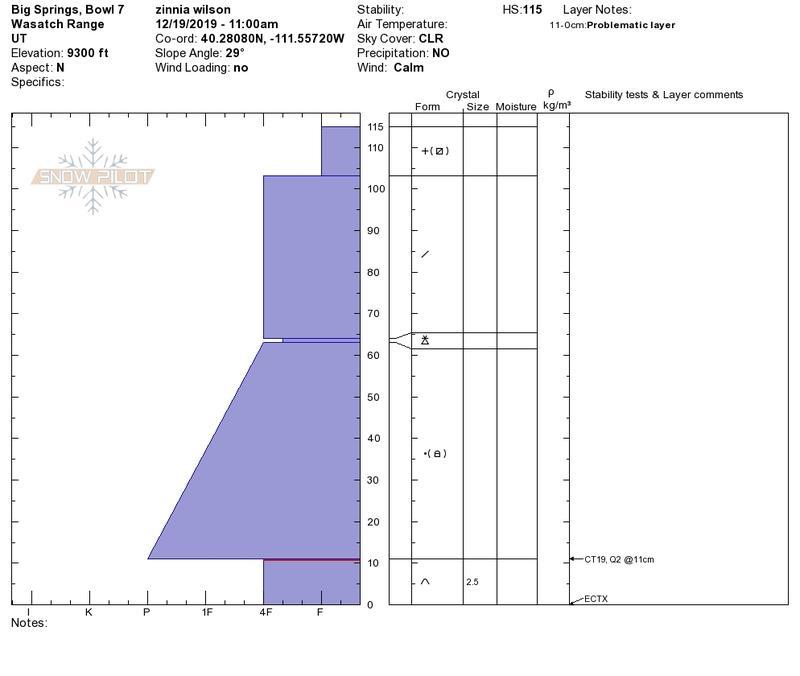 We could see several avalanche crowns in upper elevations, north-west through north facing. We didn’t get into the paths to investigate, but suspect they failed in the 12/14 storm. We didn’t see anything that appeared to have gone into the old snow at the ground.