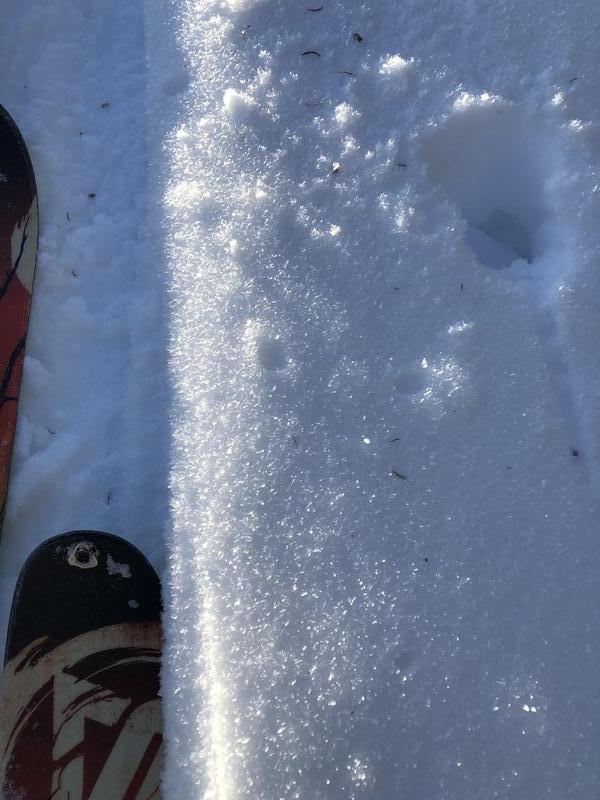 Surface Hoar forming on just above all sheltered aspects, larger NW through NE, but not wind damaged in a lot of the area. Snow pack is well consolidated, but we were a little surprised to find how weak it still was mid bowl on rocky breakover, tail punchy and felt much weaker that more exposed terrain. It is right side up, but in these sheltered areas and near large rockbands was noticeably weaker. No slab present and we were comfortable center punching the bowl and hoping our laps will add some strength through skier compaction.