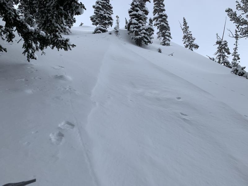 The new snow was variable in its distribution with generally more snow at lower elevations and less the higher up one traveled. The new snow was deep enough to prevent bottom feeding on the lower angle slopes and especially on northerly aspects. On west facing slopes we could feel a crust in the steepest terrain. It helped to ski just on the north side of trees to avoid the crust. The new snow generally bonded very well with the old surface on the north aspects. On the steeper west aspects we were triggering moderate sized sluffs. There appeared to be no slab in the new snow in the generally wind sheltered areas where we skied. We saw no cracking or other signs of instability except for the aforementioned sluff from skiing and one point release in very steep terrain (photo below).
