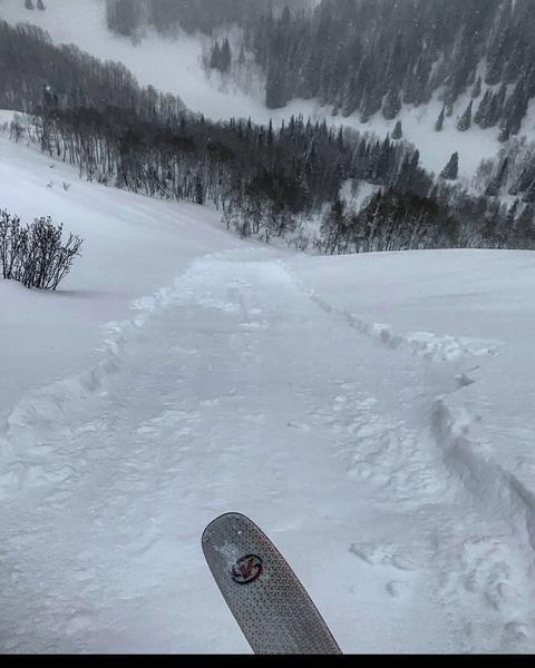 Travel today was up Mill D to Reynolds Peak. Our first stop was the most northerly slide path on the ridge line, probably the steepest path on the shoulder. We wanted to see how the new snow was bonding to the old surface so we decided to throw in a few ski cuts in the starting zone. Theses ski cuts initiated long and fast running sluffs. The sluffs were starting in the faceted snow sitting on last weeks rain/rime crust then steeping down almost immediately to the slick bed surface. The sluffs were not propagating or doing much cracking and behaving like sluffs not avalanches. We then proceeded up to the main bowl and remotely triggered a real avalanche that I put on the avalanche list that cracked out and propagated 100 or so feet up the ridge line. My theory it's that the denser layer of snow/rime crust on the surface formed a more of a connected slab and caused this type of soft slab avalanche instead of narrow long running sluffs, that we were experiencing earlier in the day, just a theory though.