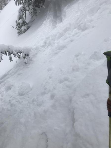 Had some large slow moving skiffs while skinning up the steeper trees. One of them slid down and took out the skin track below (picture). Enough to knock a skier down but not enough to burry a person. Skiing down fairly large sluffs were breaking loose but everything was moving very slow.