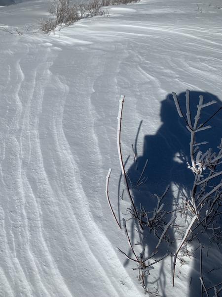 Started my tour around 0845 after listening to some high winds and thunder last night. Trailhead was in the upper 20s this morning and wind was blowing hard at all elevations. Snow was falling steadily till around 1100 when the skies started to break. Winds remained strong but continued to die down throughout the day. Looking at the trees, there is around a 1/4" of rime from winds out of the west. On the ground, there was a mix of snow and graupel. All this is to say that this storm had some strong winds and was warm. Got lots of big collapses and some cracking in the trees on the way up. Skiing was decent and didn't get any collapsing or cracking (possibly due to the skier compaction). There seemed to be around 6" of new, light snow in most places. W and SW facing slopes were a mix of wind loaded and wind scoured based on local terrain. Lots of wind loading on E and NE facing slopes. New Snow didn't seem to create a soft/storm slab. I'd be more concerned about sluffing and small wet loose avalanches in select areas.