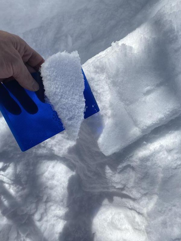 The sun came out today and warmed the snow surface on all sunny aspects leaving a crust of various thickness for tomorrow. It also created a new specimen of my favorite weak layer, Radiation Recrystallization. On southeast aspects above 9000' the strong warming from the sun was not enough to overpower the strong radiational cooling at the surface and we are left with this perfect balance of incoming and outgoing radiation. The result is warming below the snow surface that initially melts then freezes into a crust. The strong temperature gradient that exists both above and below this sub-surface melt-freeze crust creates weak snow sandwiching strong snow. Not a good recipe as we move into the future, unless you really want to make avalanches. Time will tell if this becomes a problem as this layer gets buried and we watch it evolve. You can see the thin crust in the photo below with dry weak snow above and below.