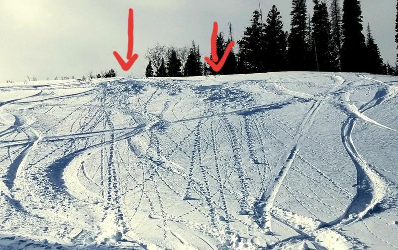 Also in this photo are two pits (indicated by arrows). It's great that folks are digging into the snow to see what's going on, hopefully aiding their decision making. Less great is that these pits were not back filled (they are now). They also sit just below the crest of a convex rollover on the most common exit from Cutler Ridge. This creates a real injury risk. Please refrain from putting pits in common skiing locations, and wherever you put them, fill them in when you're done.