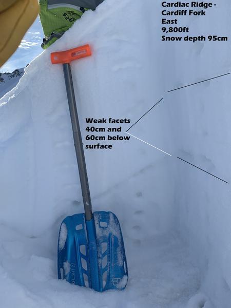 We dug two snow pits on east facing aspects at 9,800ft that were below Cardiac Ridge Run proper. There are two very distinct weak layers that are particularly faceted. Both of those layers are less than one meter below the surface and have a 1F slabs above them. The result of the extended column tests in both pits was ECTX. About 20ft away from one of our pits we were surprised to find a very thin spot that was completely faceted top to bottom.