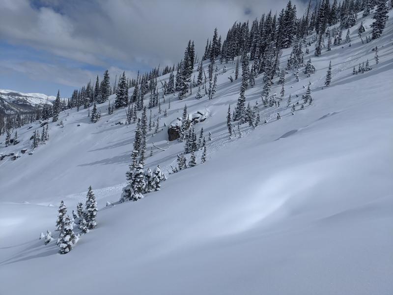 I got out today and found a foot of settled new snow above 10k. Between the afternoon sun yesterday and denser new snow, the snow skied slow and inverted. When skiing a steep but short west facing line in and around the trim line I was able to get the new snow to crack and propagate around my feet and into the bowl but no movement. I also saw a natural point slide that likely slid yesterday afternoon when the sun was beating on it. It was very manageable.