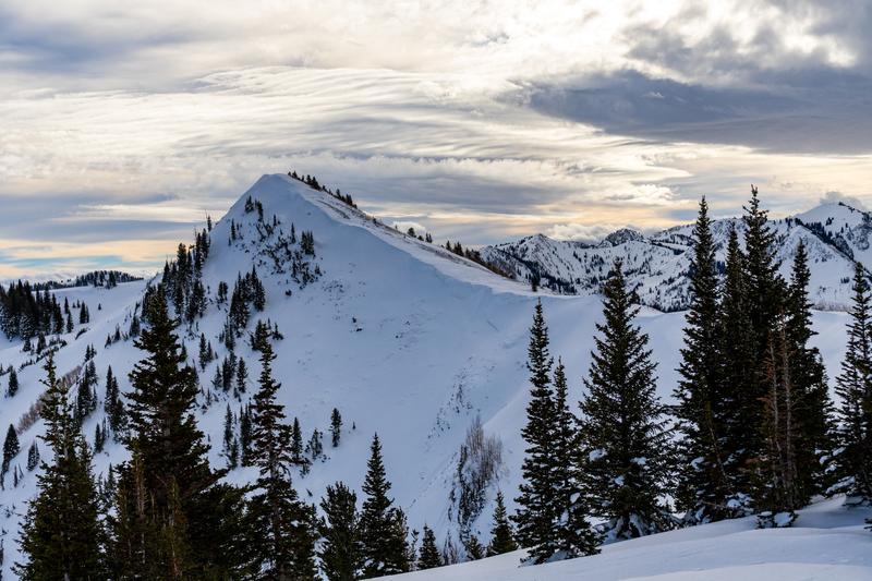 A few photos: 1) still wind loading along the Park City ridgeline making the tops of the east facing avalanche paths very fat with a huge amount of snow weight. Wind loading still in progress today. 2) the wind loading off the ridge has plastered the fir and spruce with lots of wind drifted snow, making a photogenic contrast. 3) The old avalanche off Scott's Peak, which is now mostly filled in by wind loading, 4) The monster avalanche from several days ago in West Monitor is still visible but partially filled in.