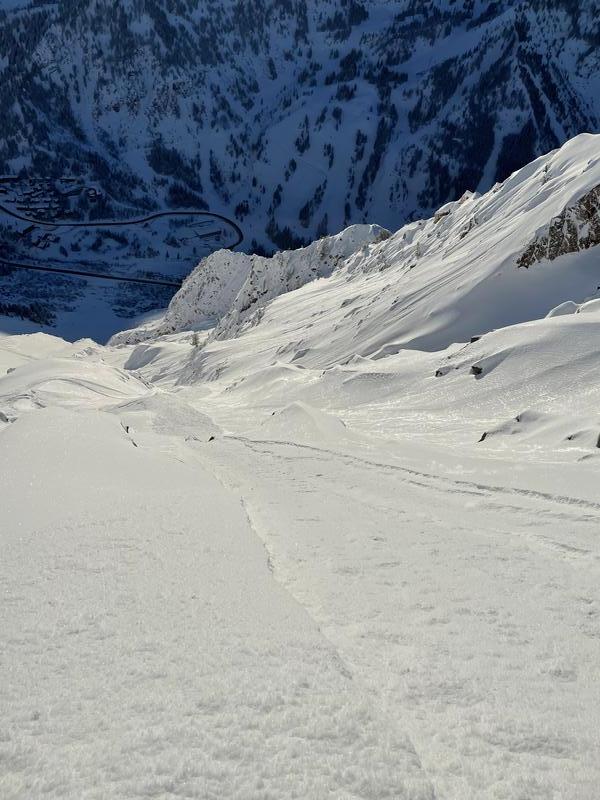New snow sluffing on crust layer. Sluffing ran 500 feet.