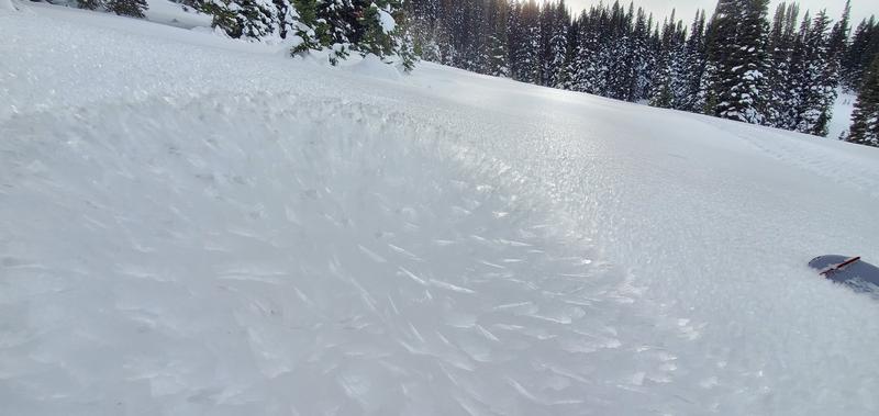 Massive Surface hoar 1"+ made for some fun noisy turns, surface conditions are generally surface hoar and near surface facets. This will likely make for problems when new snow arrives.