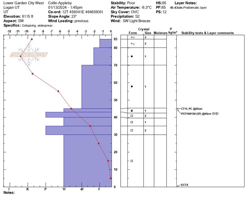 Out for some low angle, low risk adventure to take a peek at the snowpack. The winds had quieted down for most of the afternoon while out, at least below treeline. A soft, pillowy surface and firm, plush chunk of storm snow building up appeared alluring at first, however, even a few steps off the skin track and there was widespread collapsing even on slopes around 20 degrees. West aspects appeared to have experienced the most scouring. The facet layers from the December dry spell quickly revealed themselves with trap door-like conditions once you stepped off your skis/board. Test were a mixed batch of results, see below.
