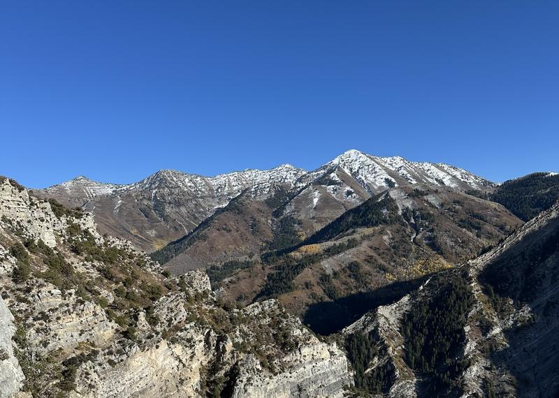 October 19 coverage in upper Dry Fork, looking towards Provo Peak, Freedom Peak, and Shingle Mill Peak. Generally, some snow cover remains above 9000' on northerly aspects, particularly on higher elevation slopes. Thanks to Mark Belabi for the photo.