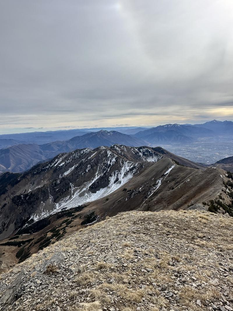 We traveled up Khyv Peak Road from Hobble Creek to climb the west side trail up Provo Peak. From there, we traveled south along the ridge and eventually down through the terraced, West-Facing slopes of Corral Mountain. We went to see the extent of existing snow coverage along the higher peaks in the Southern Wasatch. We found very few areas where old snow remained, and even fewer areas where coverage is consistent enough to pose a potential problem with future snowfall. Still, there are some isolated slopes and terrain features above ~9000' on northerly-facing slopes where I would be wary after future storms. The good news is that aside from these isolated Northerly aspects above 9000', every other slope is completely dry, with no existing snow coverage.