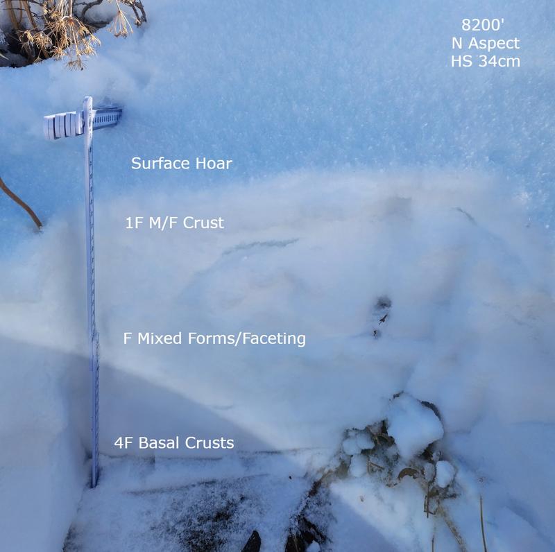 Snow level around 7000' was mostly a couple inches of melted and refrozen crud. Above 8000' there is 10-15" of snow that has more of a concerning structure, with the new snow from last week decomposing and weakening with a melt freeze layer on top. Large (15-20mm) surface hoar was present on most slopes, with it being larger on sheltered northerlies. Snow surface became damp on southerlies by mid morning. Still got a long way to go to consider any of this skiable but it is worth noting that the Ben Lomond area does seem to have the most snow in the Ogden region coming into the next weather system.