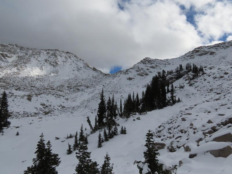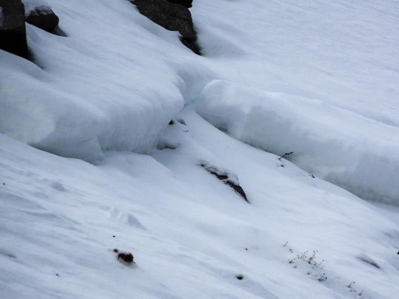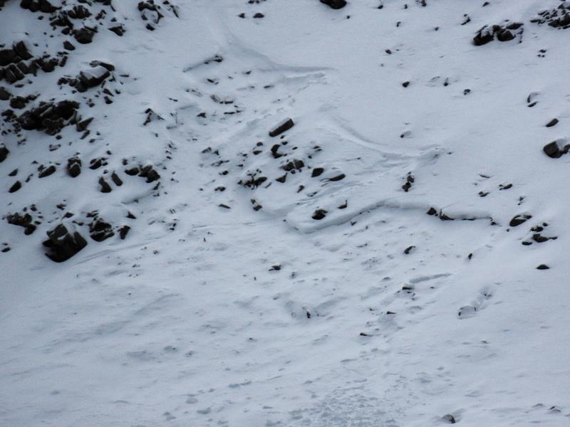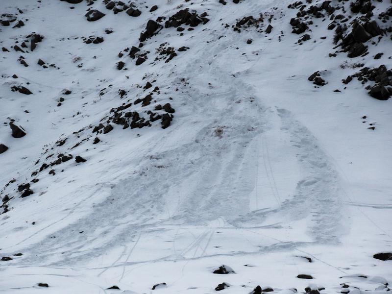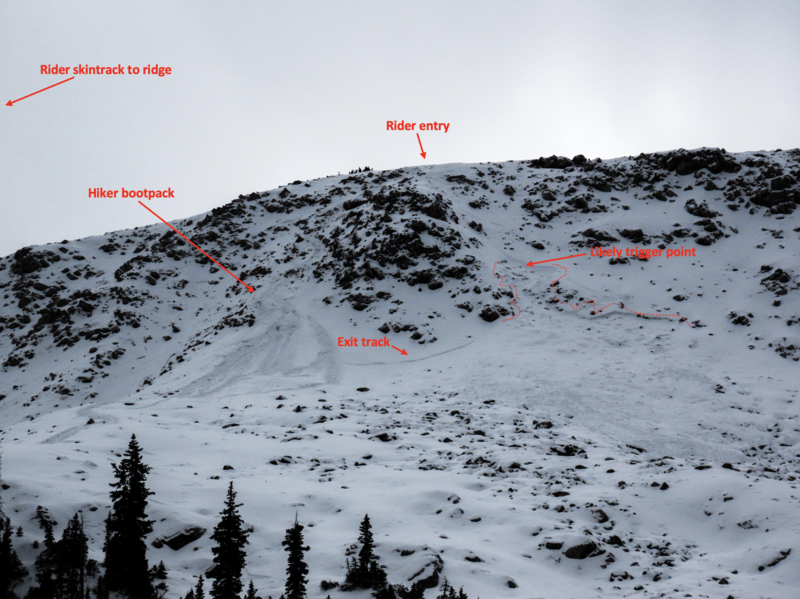 This likely snowboarder-triggered avalanche on a NE aspect near 10,600' was ~13" deep, ~150' wide, and ran about 200 vertical feet. 4-6" of dry, wind-packed snow initially was triggerd and stepped down to the 8-10" of the weak faceted grains that make up the majority of the snowpack in this basin. While there are various, thin melt-freeze crusts mixed in from our warmer periods earlier this month, the snowpack is made up of a majority of FCs of various sizes. A huge thanks to our public observer Christoph who let us know about this avalanche on his hike up the Pfiefferhorn the day prior (see his ob here).