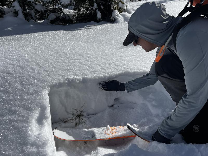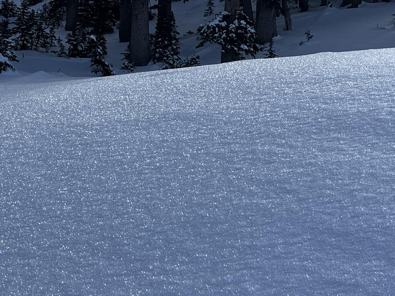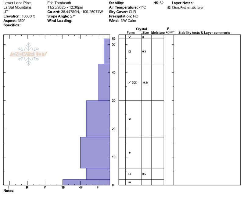 We dug this snow pit at the base of Lone Pine and found a generally right side up snowpack, 52 cms (20 inches) deep, with small grained facets developing in the upper 10-15 cms (4-6 inches). This will be our primary layer of concern if anticipated snow arrives this weekend.