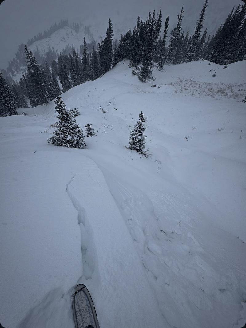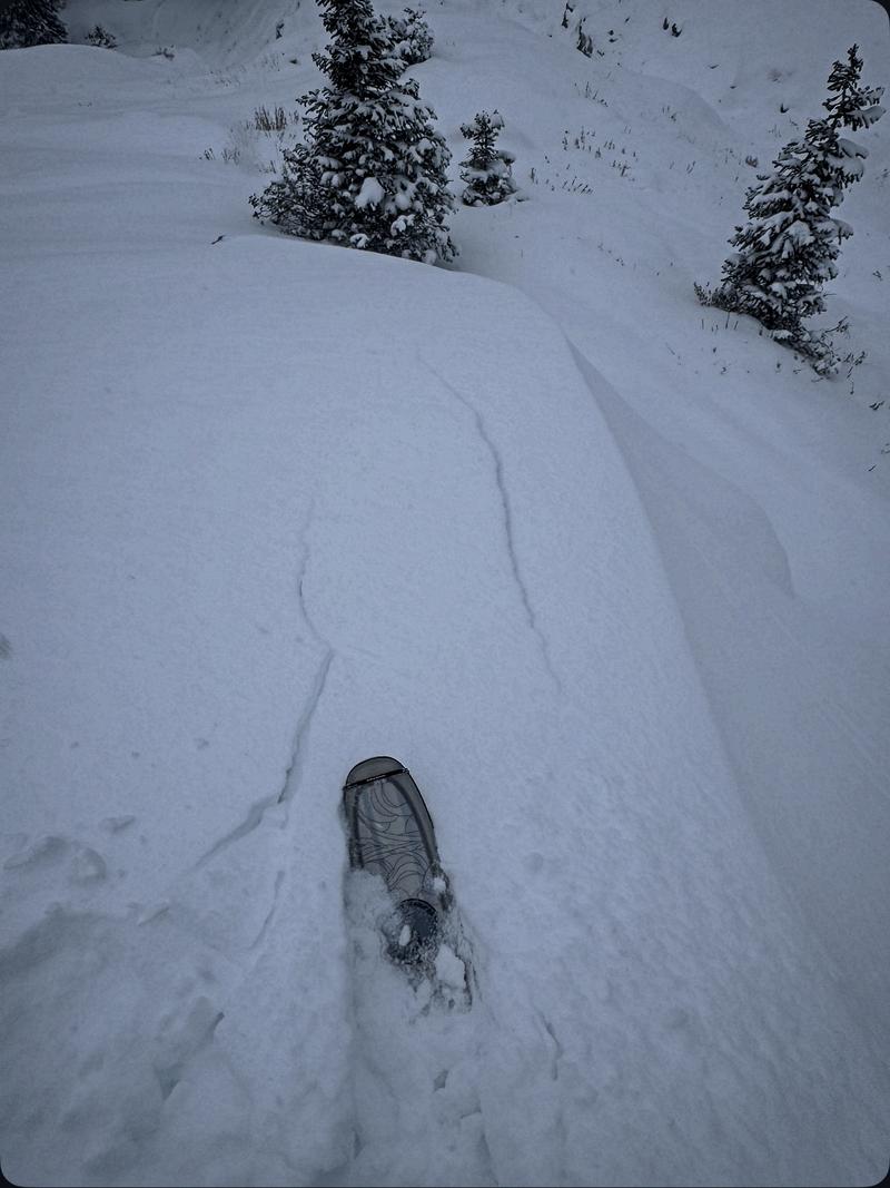 Took a quick trip up to So Long this afternoon to have a look at the new snow. There was around 6 to 8 inches of new light density snow resting on rocks and dirt down low and on the solar aspects, on the polar aspects the snow landed on extremely weak faceted snow from previous storms. The wind was blowing from the NW, not very strong at mid elevations but a bit more stout in high exposed terrain. Any terrain that the wind had effected on the polars would crack when provoked. There wasn’t enough of a slab in the terrain covered to cause a avalanche but it’s a thin line between not enough and too much. You can pretty much plan on avalanches in high, wind affected terrain that had previous snow. These places are spotty but they are also the places that are skiable right now. We’ll have to wait and see how the snow stacks up this week and if we get a connected slab that will run on the facets.