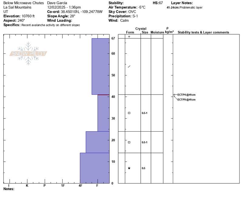 I poked at a north-facing slope off the Laurel Highway at 11,260'. HS, snowpack structure, and test results were very similar to what Eric and I found in Colorado bowl on Monday. ECTP 8 and ECTP 9 down 26cm, failing on 0.5 - 1.0 mm facets. This layer was buried on 11/30, so from here on, we will refer to it as the 11/30 weak layer. It's worth noting that the overlying slab here is F density. This is somewhat tricky because the slab is so soft that I am not getting collapsing or cracking in my travels, but it is definitely capable of producing shallow, soft slab avalanches on steep slopes where the slab has just enough cohesion. High elevation slopes that have received any amount of wind-drifted snow are especially suspect.