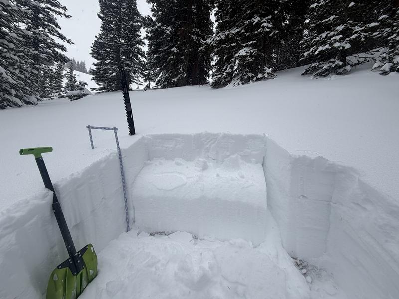 The photo below is my north-facing pit, near Coyote Chute. It is easy to see the weak layer at the new snow/old snow interface on the left pit wall.