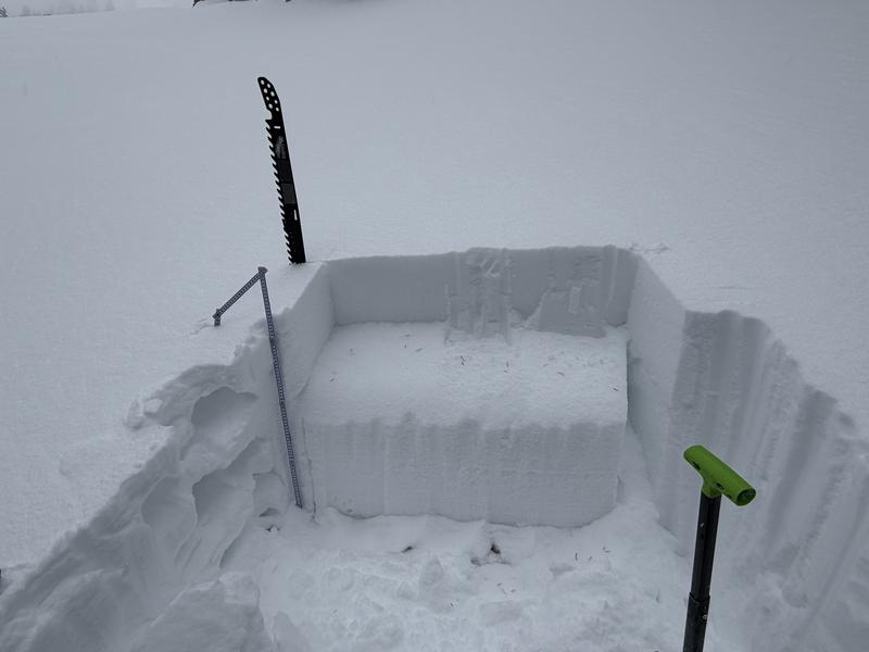 Unfortunately, this problem exists on slopes that face southwest and west. Many slopes near or above treeline with a west or southwest aspect were subjected to strong sun and/or strong winds and do not have much of a snowpack at all. The PWL problem does not exist on these slopes. I got on a sheltered SW aspect near treeline today with a relatively deep snowpack (67cm, deep for right now). This snowpack had a very similar structure to what we have been seeing on the northerlies. This SW-facing pit produced ECTP 4 and ECTP 9 on the same weak layer that has been failing in our other pits. Not great news. If you find yourself on southwest or west-facing slopes, and the snowpack is deep, dig down and look for the weak layer; it is easy to find.