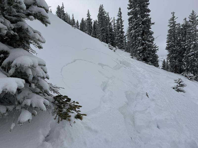 New snow layer wasn't cohesive enough to get slabbing on wide open faces, but was able to get localized cracking on smaller convex slopes. Cracking above the feet but not sliding at all, even though this exact slope was around 30-35 degrees