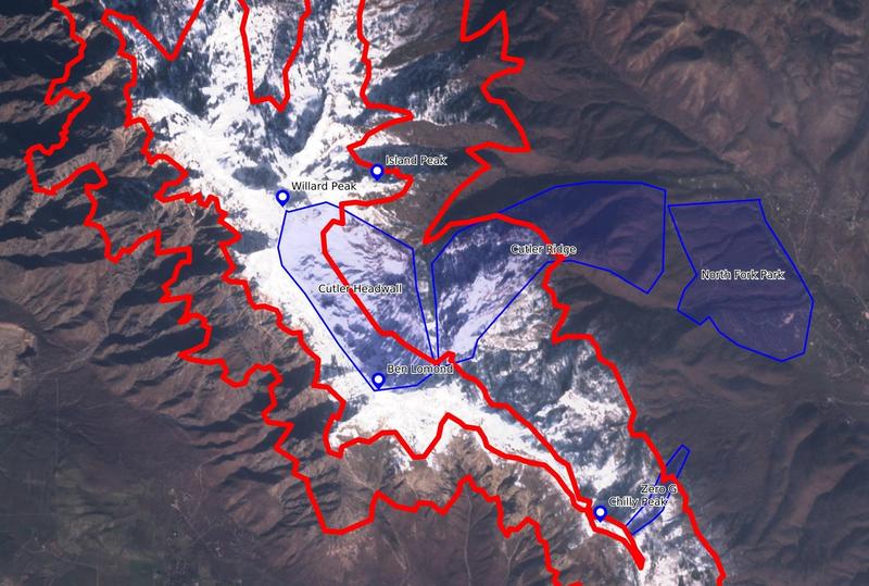 The red lines in the images are approximate contour lines for 8500ft and 7000ft, which differentiate Ogden's upper, mid, and low elevation bands. The outside edge of each image is the low elevation band, the inner part of each image is the upper elevations, with mid between the red lines. Indicated in blue are some well known landmarks, zones, etc. to help identify the features in the satellite imagery. The entire Ogden skyline is posted here from north to south: Ben Lomond, Chilly Peak, Lewis Peak, and Mount Ogden.