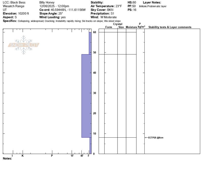 We dug a quick profile at ~10,200 ft on a 25° S-facing slope with a total snow depth of 60 cm. A thin snowpack structure was present, with lower-density storm snow sitting on top of heavier new storm snow. This storm's snow rested over a weak layer at 8 cm that produced an ECTP25, matching the collapsing we experienced while moving through the area.