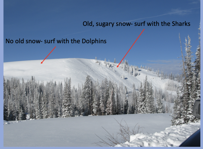 Both slopes look similar, but just a nuance in aspect change is the difference between a relatively safe, sunny slope with no old snow (it's where the dolphins swim ) or a dangerous, sketchy snowpack (it's where the sharks live )