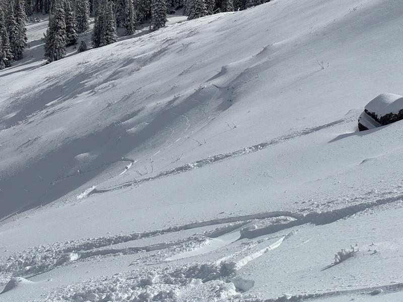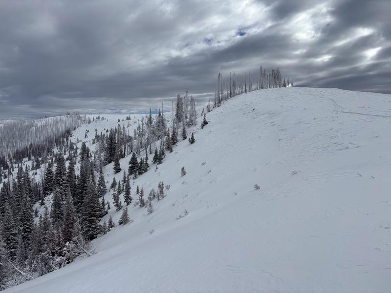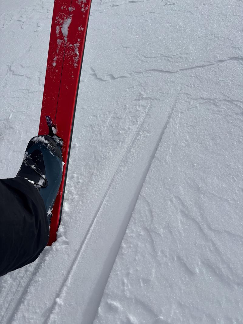 Walking along this ridge, we collapsed it near a small thin spot on a rock outcropping, and shooting cracks went all the way up the ridge. There is just not enough old snow beneath the slab in shallower places, and slopes are arresting and shattering once collapsed, versus avalanching.