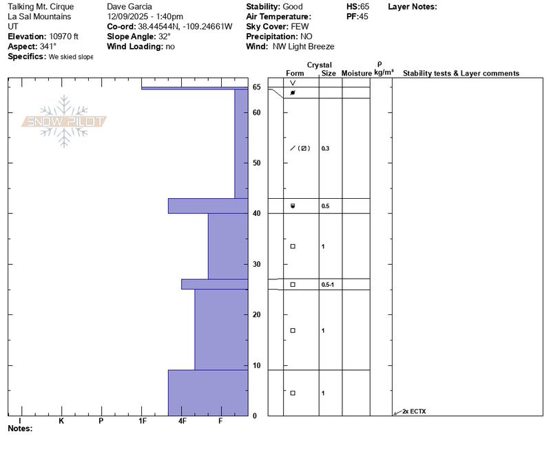 One consistent theme of my tour today was a lack of red flags. There's not much going on out there right now, and the snowpack seems to be deteriorating due to cold, clear nights and warm sunny days. The 11/30 storm snow is becoming weak and faceted, which means decreasing danger for the short term. When it snows again, we will most likely face significant avalanche problems. The pit profile below was dug on a north face above treeline at 10,970 feet. Nothing was alarming about this pit, besides being very weak overall. Test results were ECTX x2.