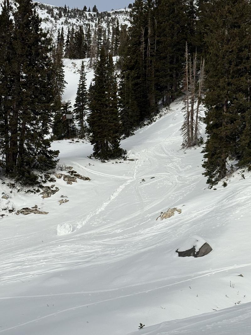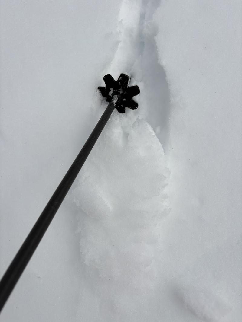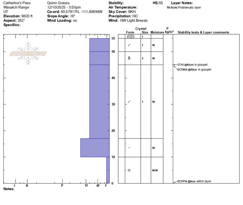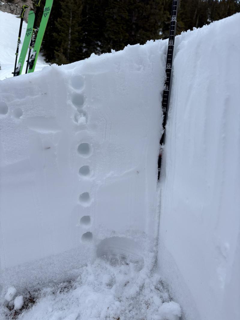 The tide is low, but it's holding on. Today felt like a cloudy spring day aside from the sun's low angle on the horizon. The surface snow was very damp and it turned into a zipper crust so skiing was quite poor later this afternoon. A layer of graupel exists in sheltered spots about 5" from the top of the snowpack. Low coverage and zipper crusts abound.
