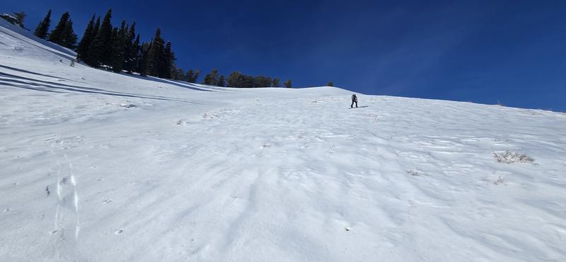 We headed out to the Northern Bear River Range today to see how conditions were shaping up. Unfortunately, the sun and some rain from earlier in the week had really done a number on the snowpack. We rode up to about 9,200 feet at the highest, and we found a thick rain crust—somewhere between an eighth and a quarter inch—sitting right on top all the way up.