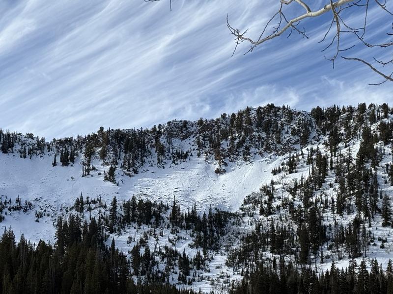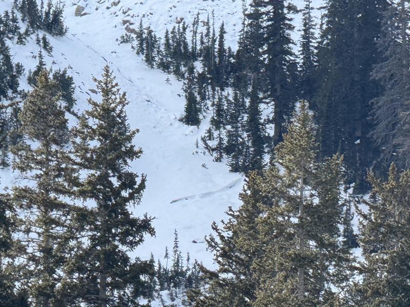 An old crown on a NNE aspect near 9500' that led to some speculation on a snack break. It likely ran during the height of the storm last weekend, close to the ground on weak old snow, and then was affected by the multiple days of above freezing temperatures.