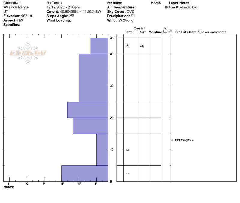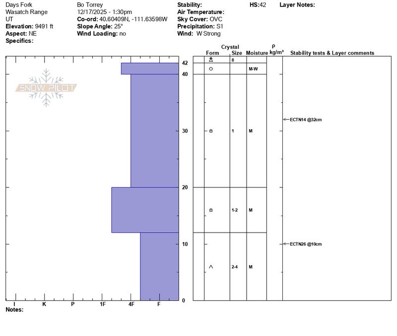 I traveled up the Flagstaff Ridge to look at slopes in Upper Days Fork and see how the snowpack was responding to the recent dry and warm conditions. During the early December storm cycle, each named ski run along the upper cottonwood ridgeline from Upper Days through Hideaway Park avalanched at least once. Looking at the remaining snowpack in the Upper Days starting zone showed 4-6" of dry faceted snow remaining above a 2-4" basal ice on the ground. As snow reloads this (and similar) slope(s) I expect will avalanche again. Looking at the snowpack lower in the drainage on sheltered north-facing slopes around 9500' that did not avalanche showed a much different structure. There I found a snowpack that was moist to the ground. The weak layer near the ground was still reactive in some Extended Column Tests, but not all. While this moisture could facilitate strengthening if the weather remains active and the pack deepens, a return to cold, high-pressure conditions would likely weaken the snowpack further. Something to keep an eye on.