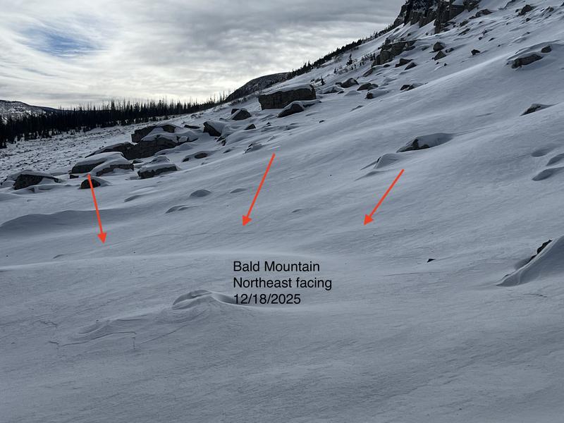 I experienced several collapses and cracking as I traveled around the north side of Bald Mountain. This area is still thin, shallow and rocky with very weak snow near the ground.