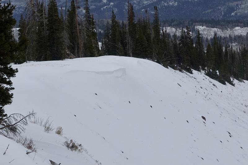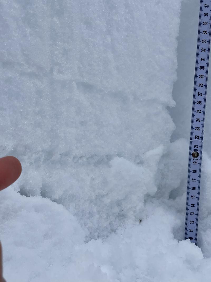 A few interesting discoveries were made during travels near Duchesne Ridge today. The most notable would be the return of cracking and collapsing, but only in the wind zone The new snow seemed to need to be "indensified" by wind in order to communicate a failure over any considerable distance. In avalanche terrain in the area, this notion is almost visible on slope: loaded start zones with fat, stiff, wind deposits, uphill of a really visibly thin snowpack (see attached photo). The second discovery was a snow profile containing almost entirely weak snow. Present is the slightly-rimed buried surface hoar that has been found elsewhere (see attached photos). These grains are hard to photograph due to their now "crusty" appearance, likely from rime when buried on 20251130.