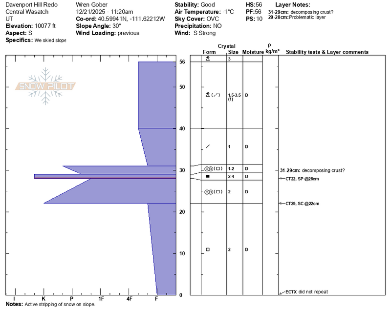 Weak pit profile full of decomposition and CTH results at 28cm and 22cm, with sudden planar and sudden collapse fractures respectively, indicate continuous, defined weak layers. I also got a ECTX on one ECT, I did not repeat for consistency. The poor snowpack structure found in the pit felt fairly contiguous across southerly slopes in my area via hand pits and pole probing. While I observed good stability both on my skis and in the snow pit, it seems to be a pertinent problem to watch as it warms, and (hopefully!) snows soon.