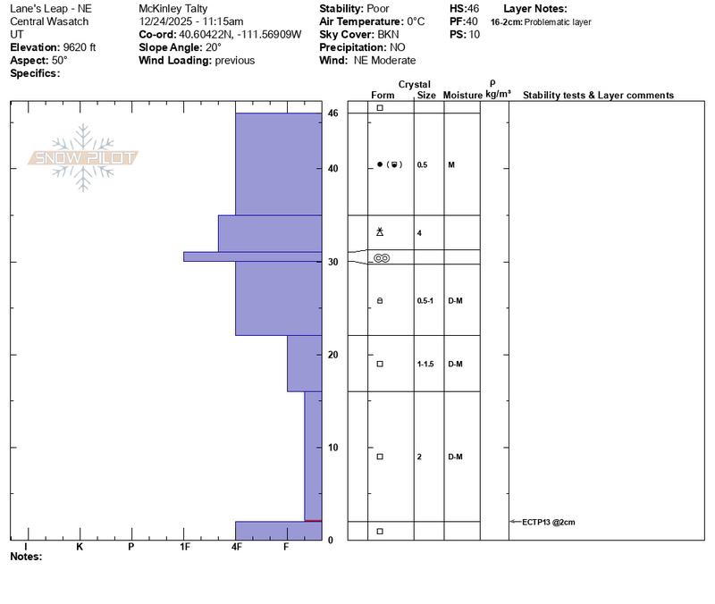 I dug a pit at Lane's Leap (NE, 9,620') and found poor snowpack structure. Early December snow at the base of the pack was falling out of the pit wall and propagated with moderate force in an ECT (ECTP13 at 44 cm below the surface).