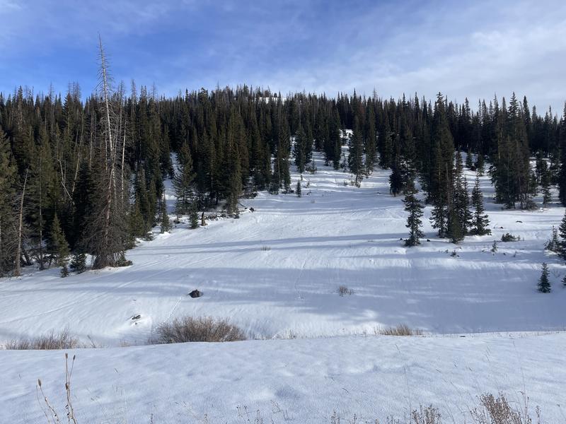 Just a box of rain, believe it if you need it, if you don't just pass it on - but this rain left its calling card everywhere we looked. Punchy, unfavorable surfaces made for rigorous low-angle turns that tested our holiday cheer. A Mississippi half-step was required, staying light so you wouldn't kiss your knees 'toodeloo'. The rain/snow line wrote itself clearly across the landscape: trace new snow that fell before the hypothesized mid-storm warm-up above 9000ft, then rain followed by a snap freeze. Topped off with another dusting from Stella Blue's rusty strings for good measure.