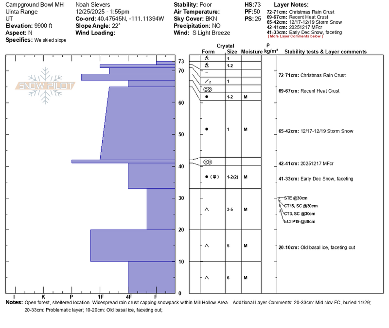 I'd rather be in some Mill Hollow, even if the sun decided to skip our travels for most of the day. As estimated prophets, we traveled high to trace our rainline towards the yellow sky and blue sun, to check in on our persistent slab problem after our warm storm overnight. Yesterday's pit at Wolf Creek Pass told one story; today at 9900 feet on a north aspect, Mill Hollow echoed the same narrative. Strong and moist, recent storm snow sits atop basal facets and depth hoar - the structural consistency between zones speaks volumes about our Uinta snowpack on the Northern half of the compass.