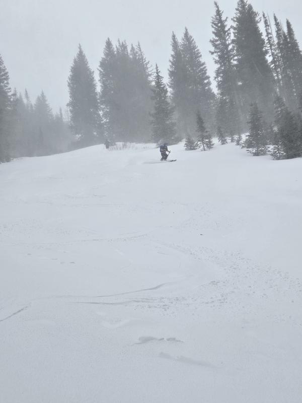 Wind loading was quite active and had already blown some pockets up to 8+" deep by mid morning. Wind slabs starting to form on the PC ridge. In the woods by lower Scott's Backdoor meadows (~9300') there was about a foot of snow, damp to the ground except for some drier faceted snow just below the stout ice crust.