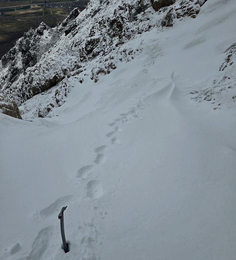 The ample wind regularly moved the surface snow, and there was a bit of spin drift. We didn't note any hard slab formation, though we were certainly on the fetch side of the mountain. There was some soft slab cohesion, but with new snow seeming to bond well to the underlying crust, we did not experience any reactivity under foot. However, we did not travel as high as the summit ridge line, so can't comment much about the upper elevations.