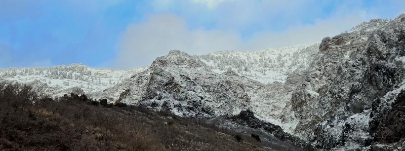 Pictured below are 1) snow surface around 8000ft with a bit of a wind lip visible and some wind-scoured surface and 2) upper elevation W facing slopes above mid elevation rocky terrain.
