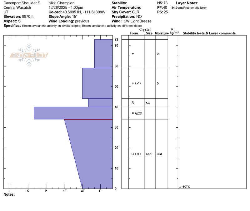 Pit profile and pitwall photo from the northerly facing Davenport Shoulder Pit - NW Aspect - 9900'