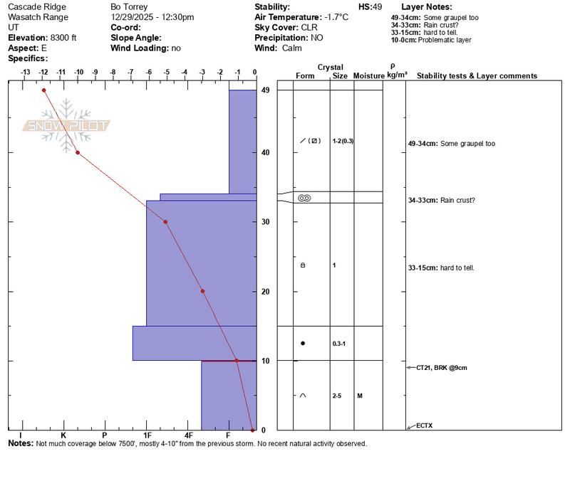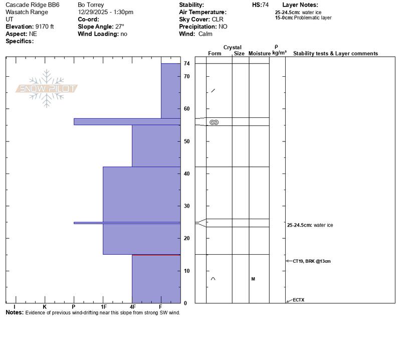 The October & November facete layer near the ground was present above 8000 feet on the North and east-facing slopes I traveled on. One of the more notable differences in my travels was the crust below the recent storm snow. Further north, near Timpanogos, nearly an inch of rain was recorded overnight Christmas Eve into early Christmas Day. In places like the upper Cottonwoods, a notable thick crust is present. In the area I traveled today near Cascade Ridge, the crust was thinner roughly 1 inch thick at 9200 feet. This area received 4-6 inches of low-medium density storm snow after Christmas. In the 2 snowpits I dug today, I had stable test results in my Extended Column Tests ECTX x3.