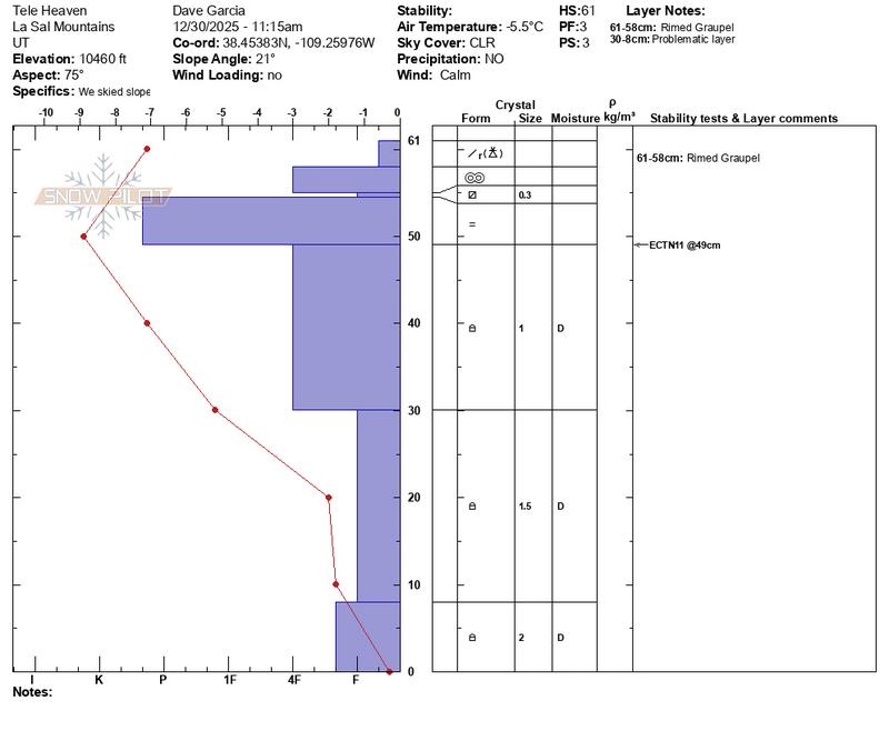 I observed a thin layer of small, faceted grains between the MF crust and the rain crust. This could be a future weak layer, but with any loading, I think our biggest problem will be the facets beneath the rain crust. Before Christmas Day, the snowpack almost went isothermal. A strong temperature gradient has returned to the pack, more typical for late December with a shallow snowpack. I expect the rounding facets to revert back and grow some sharp edges. Still waiting for our next loading event...