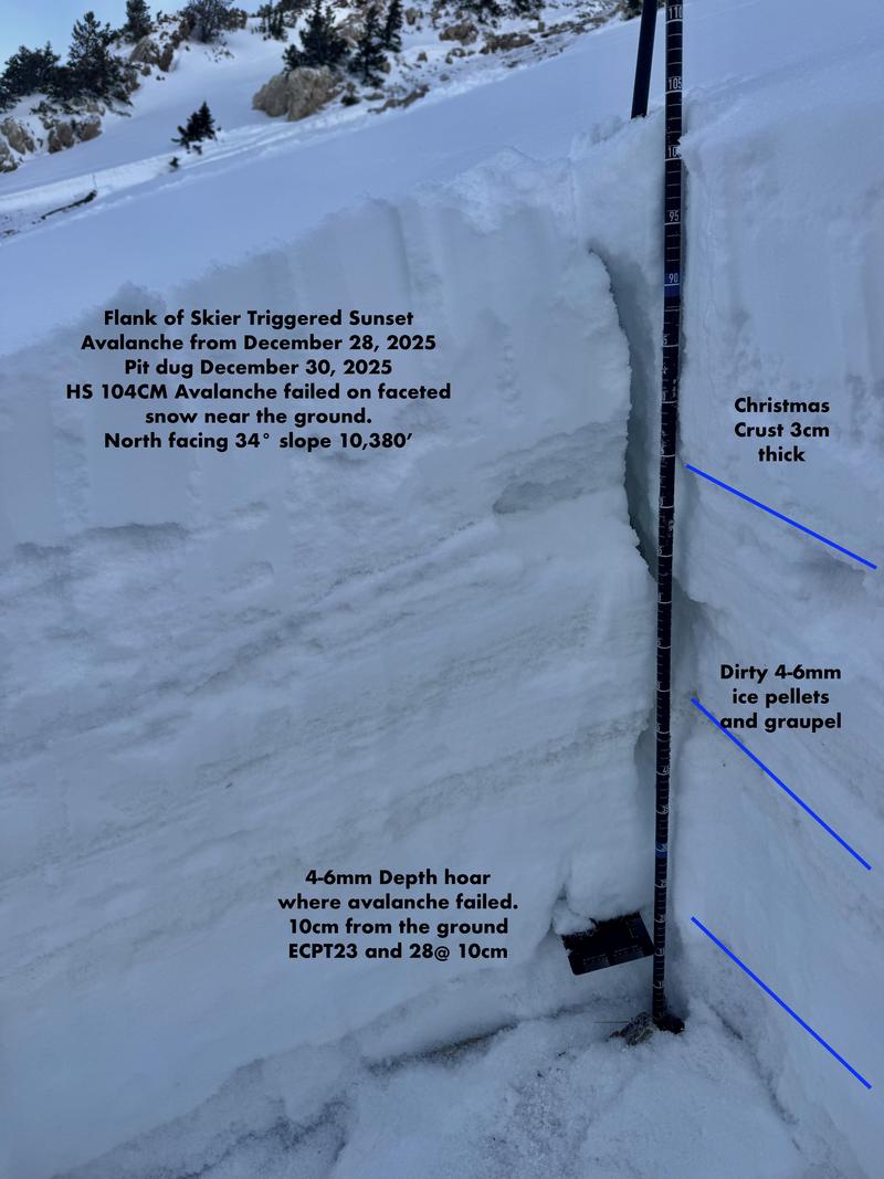 I was pretty curious about this skier triggered avalanche from December 28, 2025 on Sunset Peak. With how hard it rained on the 25th I was pretty sure that the PWL while still in place wouldn't be impacted either naturally or by skiers right away. I thought the issue would be widespread from the highest elevations in the Wasatch to the lowest. What I found on this slope was a much thinner crust from the Christmas storm. It was approximately 1" (3cm thick) and the layers of dirty graupel and ice pellets underneath and around it were impressive. The early season facets, were dry, and 4-6mm in size formed a layer near the ground that was 10 cm (4") in thickness (photo below).