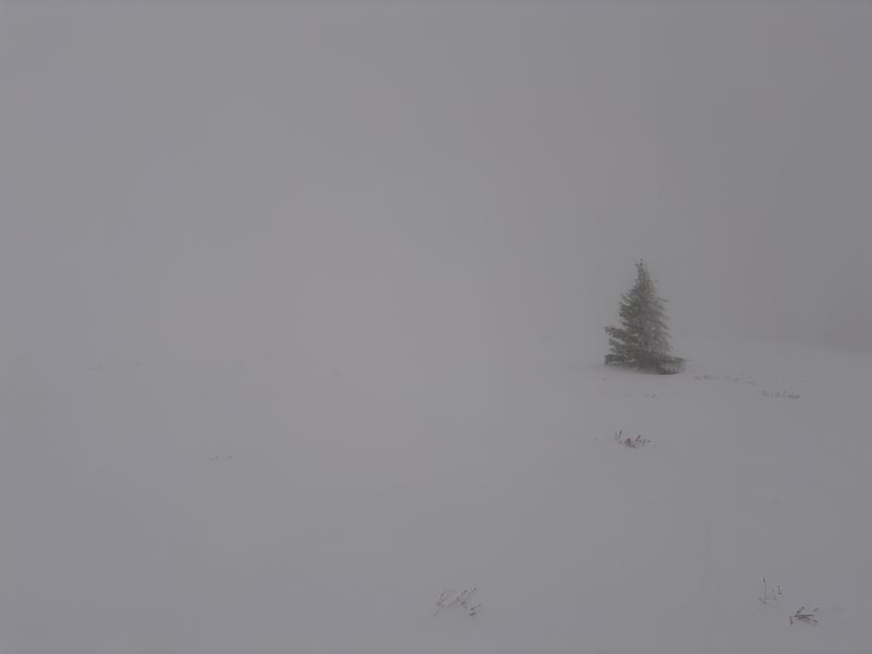 Photos 2 and 3 show the heavy fog and extremely poor visibility above treeline.